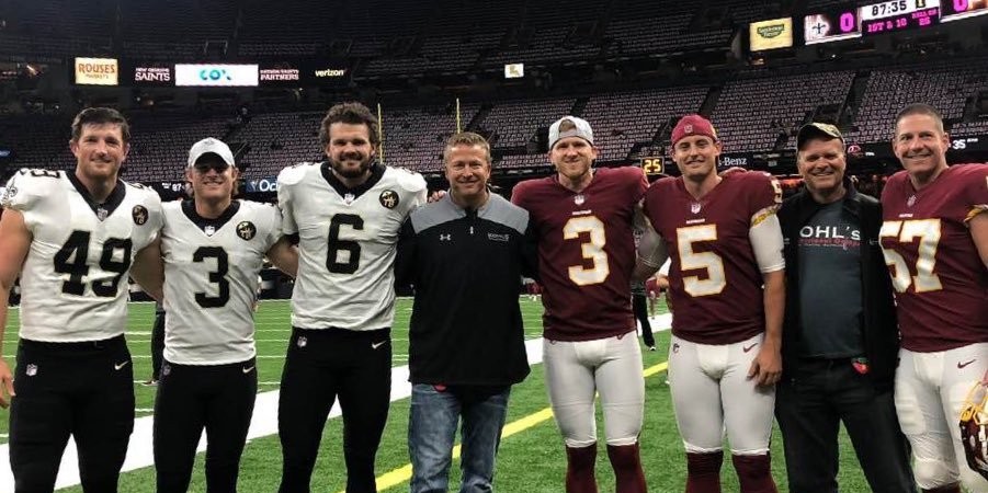 Camp Director Jamie Kohl on the sideline with Saints Specialists (Zach Wood, Wil Lutz, Thomas Morstead) and Redskins Specialists (Dustin Hopkins, Tress Way, Nick Sundberg), as well Gerald Foltz, father of the late Sam Foltz of Nebraska