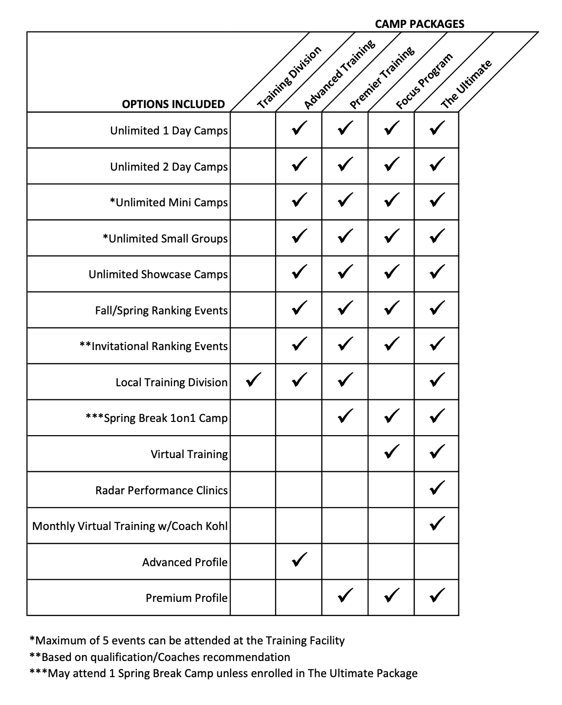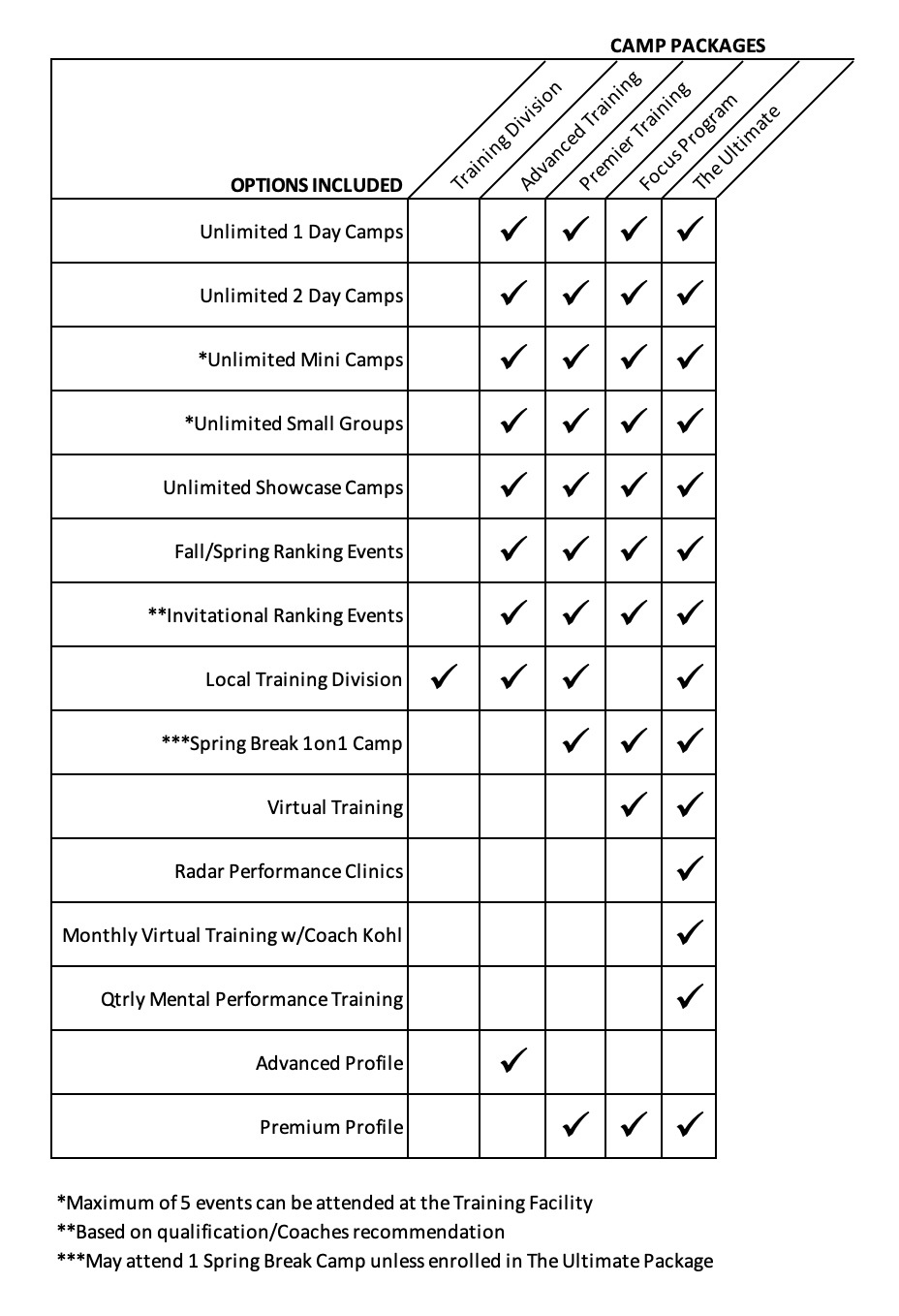 This is the year-round training option for the athlete who doesn't live in an area with a local training division. This will also include the Spring Break Camp and Virtual Training Options.