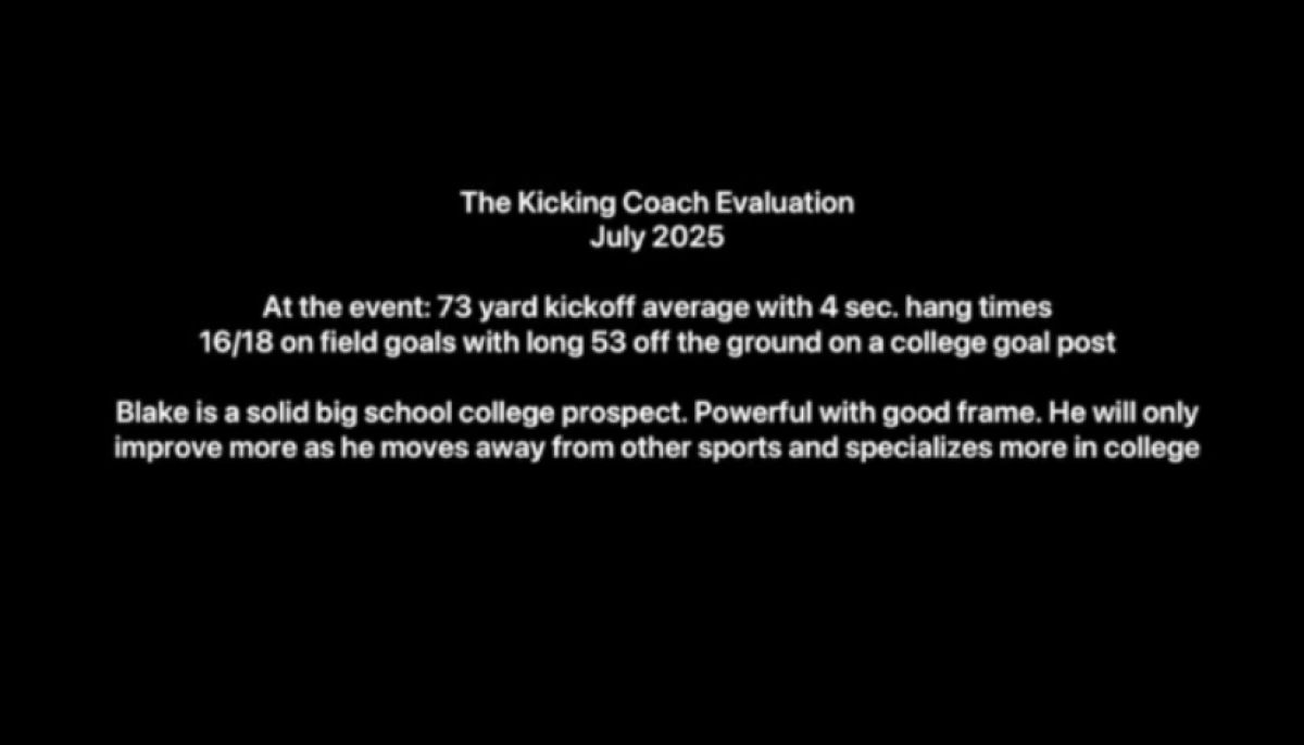 Stefanek recently kicked at Kohl’s National Scholarship Camp. He scored 22 points on field goals and 108.3 points on kickoffs at the camp in July of 2025. Stefanek showed the leg strength and overall talent needed to play in college. Stefanek also had a strong showing at the 2025 Kohl's Midwest Spring Showcase. He was impressive on field goals, converting 11 attempts during the charting session. He also posted a kickoff score of 107.85, with his best ball traveling 72 yards and 3.90 seconds of hang time. Stefanek demonstrated advanced leg strength and solid command of his ball striking. He has an important next 6-9 months ahead!