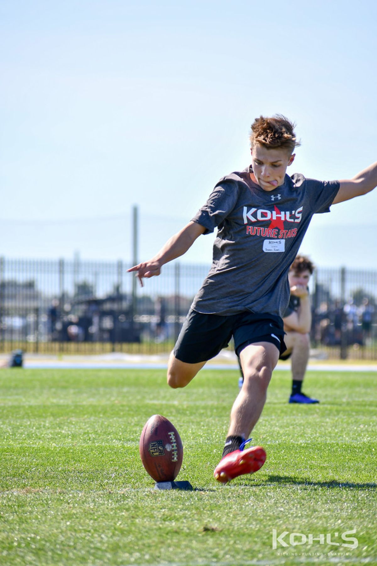 Russell recently competed in the 2020 June Showcase Series. He had a very impressive charting portion of camp on both field goals and kick offs. He made 11 points out of 15 and hit some big kick offs. He should be a highly recruited 2021 prospect. Russell also competed at the 2019 Kohl's Winter Showcase Camp in Dallas, TX. He had a great showing during the field goal charting phase of camp with 9 points made. He continues to show college level ability and we expect big things this upcoming year. Russell had a solid showing at the 2019 National Scholarship Camp. He was able to chart 20 made field goals at camp. He charted a big ball 66 yards with 3.66 seconds of hang time at the event as well. Russell attended the 2019 Spring Showcase Camp. He was very impressive throughout the camp and showed great command of his "A" ball. He made 10 out of 12 points on field goals and showed next level leg strength on kickoffs. Russell has the talent to have a bright future as a specialist.