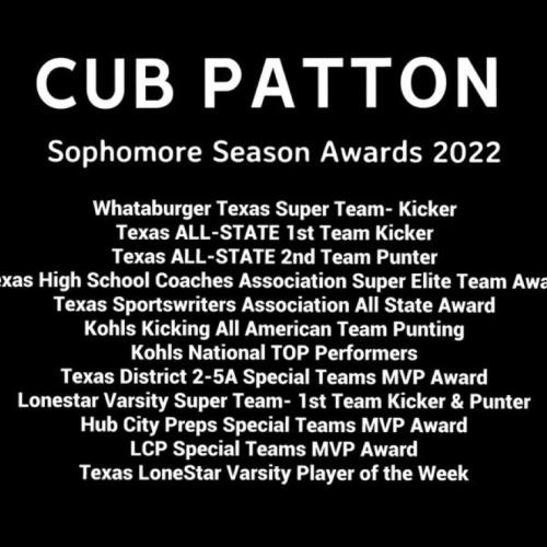 Patton attended his first Kohl's ranking event in October of 2022 in Dallas, Texas. He charted very well on all three disciplines for a 2025 athlete. He scored 7 points during the field goal charting, hit a 72-yard, 3.81 second hang time kickoff, and hit a 50-yard, 4.25 second hang time punt. Patton demonstrated that he has the leg talent required to be one of the top specialists in his class and we expect some big things form him over the upcoming years.