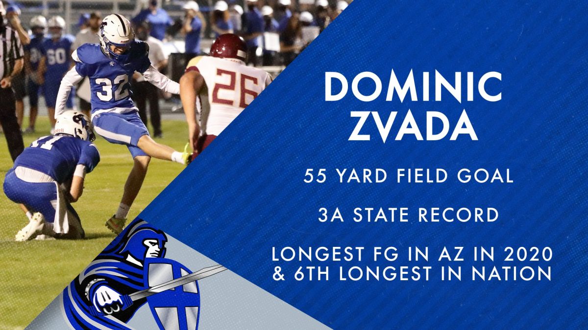 Valley Christian High School, Chandler, AZ | 2022 | Kicker | 6’2” 160 | 3A Arizona Field Goal Record Holder, 55 yards. | 3A Arizona All-State 2020 & 3A Metro-West All-Region, First Team 2020 | Twitter @dominic_zvada