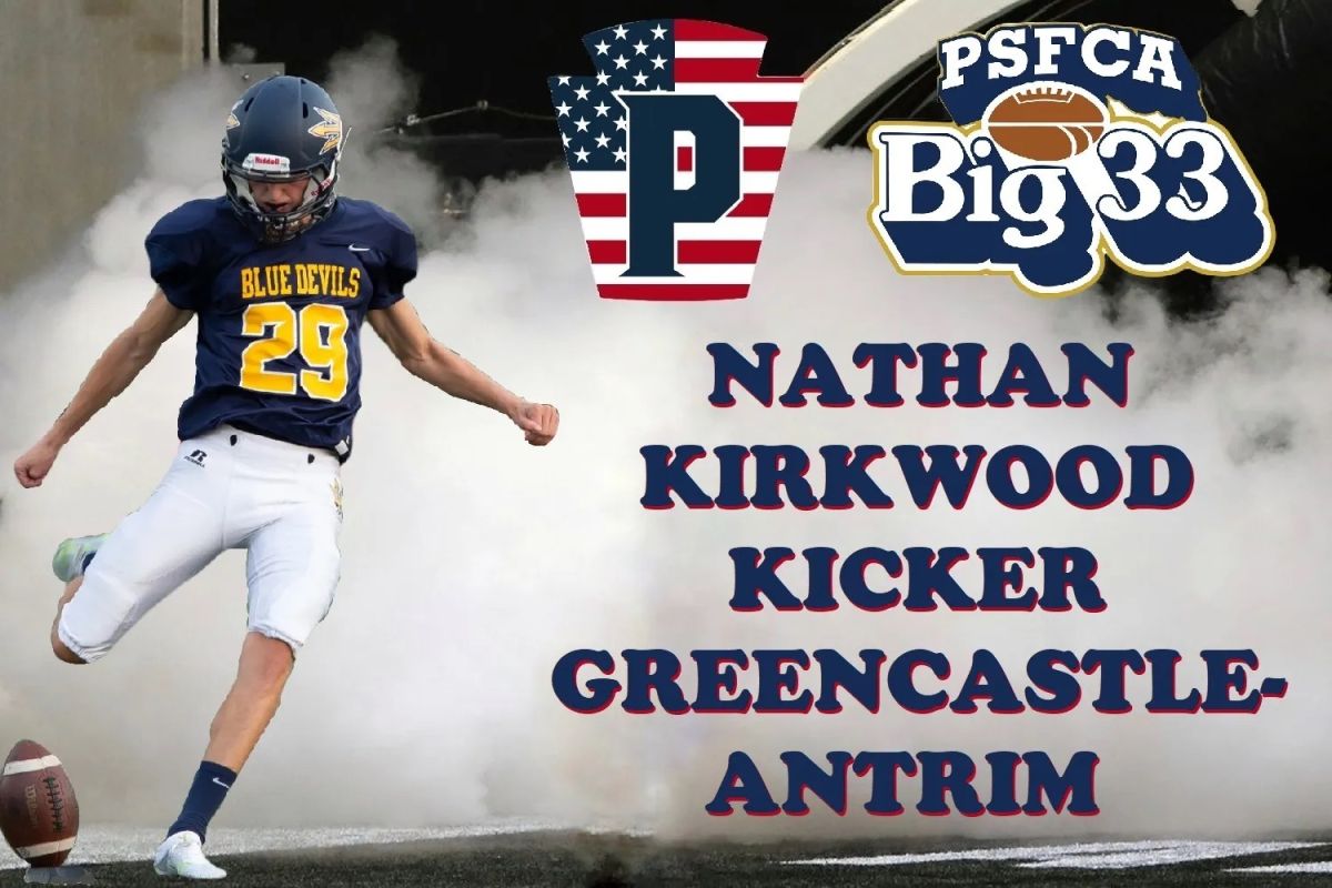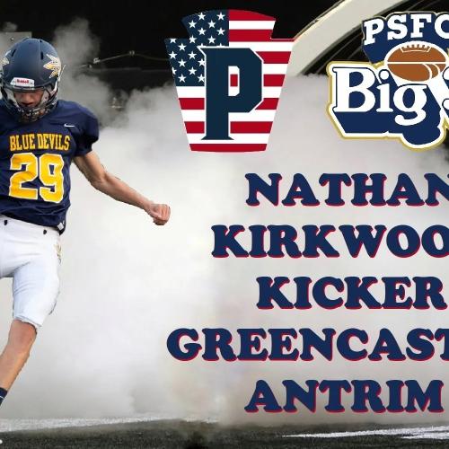 My name is Nathan Kirkwood, and I am the starting varsity placekicker for Greencastle-Antrim High School, in Greencastle, PA. In addition to football, I am also a varsity soccer captain, peer leader, school board representative, student council member, letterman in track, Leadership Franklin County Youth graduate, PA Special Olympics Unified Bocce teammate, Greencastle Flyers volunteer, Grand Point Church volunteer, and a lifeguard at Moss Spring Swim Club. In the future, I hope to attend a college with a strong STEM program, and later become a pilot.