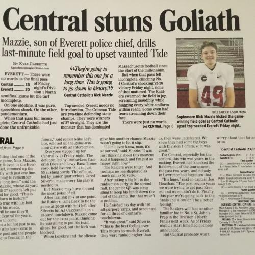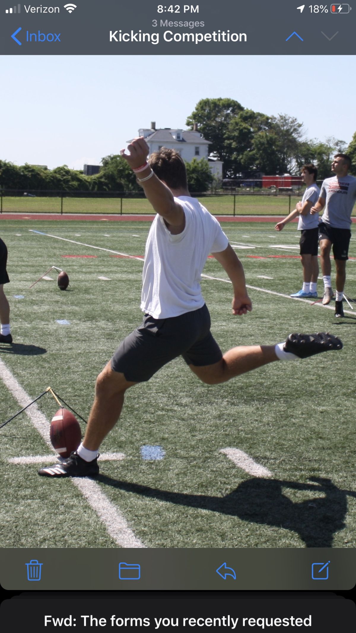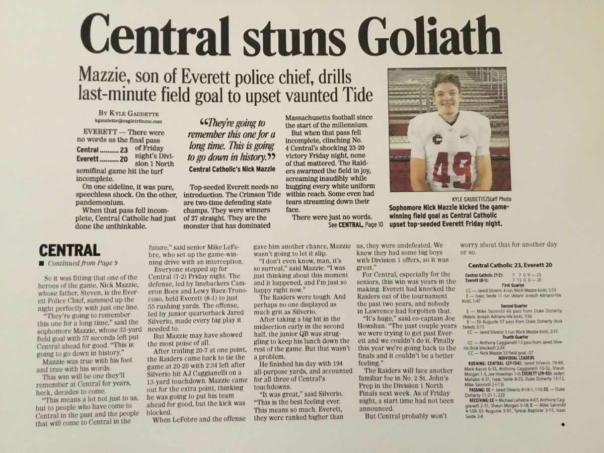 Prior to Central Catholic: Played for Masconomet Youth Football (51 PATs & 2 FGs) Top Kicker Cape Ann Youth Football League, 2015-2016, Super Bowl Champs 2016