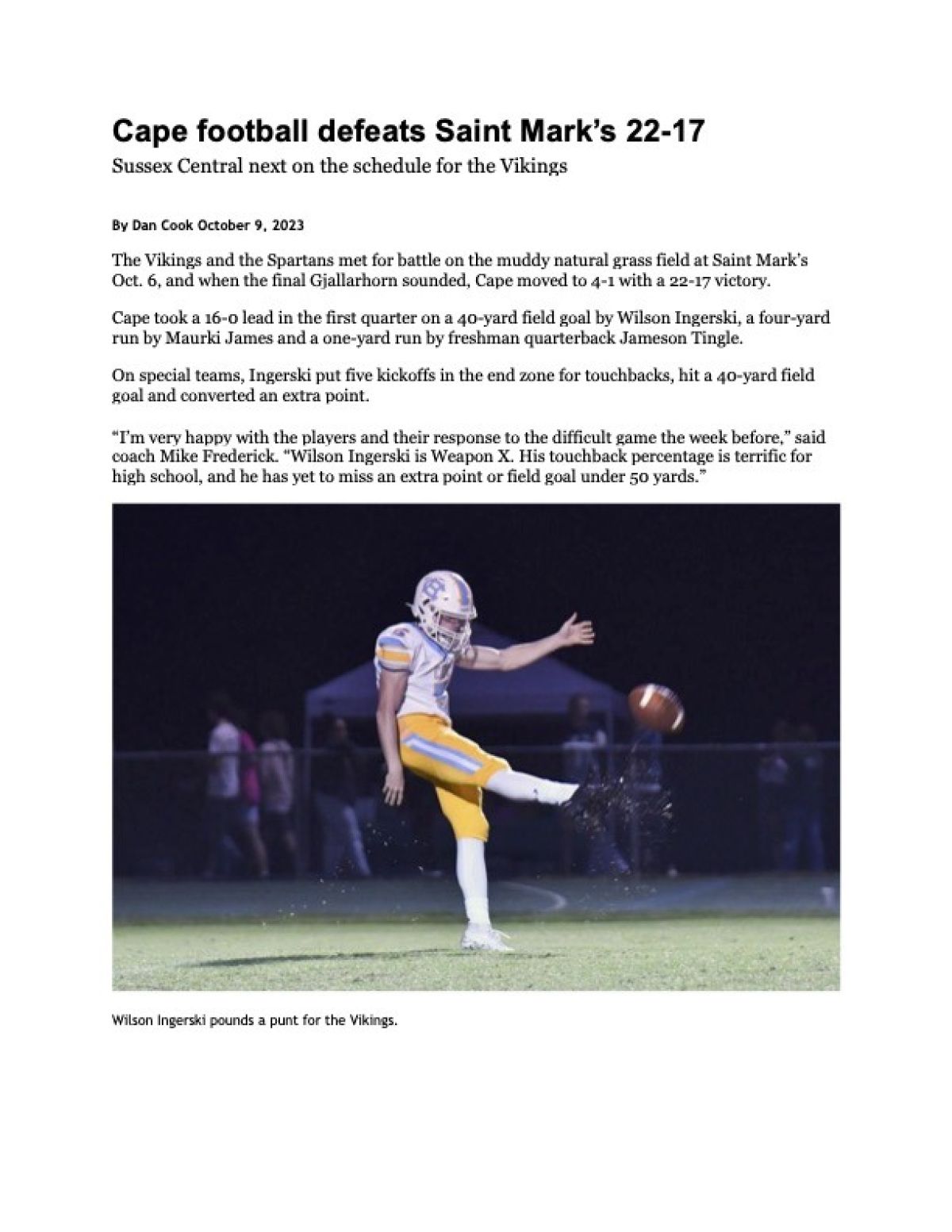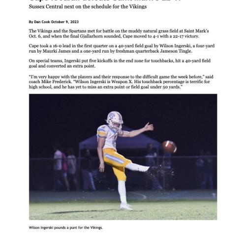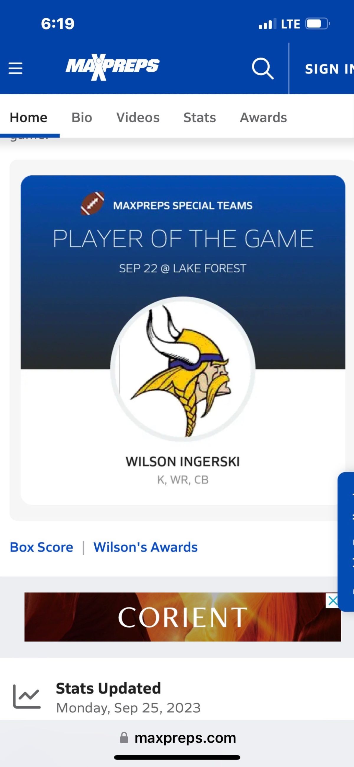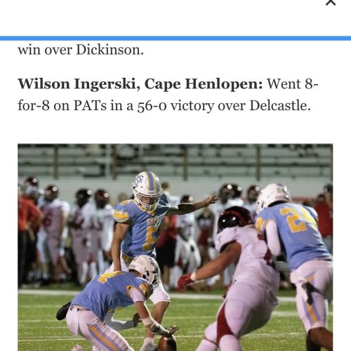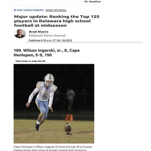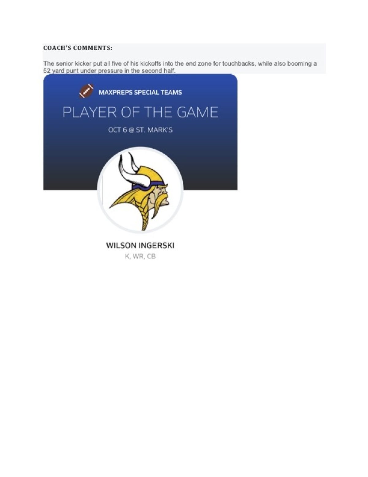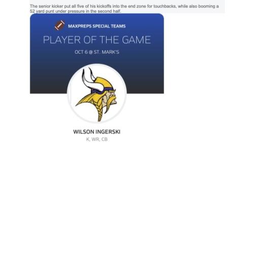 Ingerski recently competed at the 2023 Kohl's National Scholarship Camp. He has tremendous talent and is a motivated prospect. His showing at camp and solid and showed he has the skill and determination to play collegiately. He had a combined score of 19 points on field goals and was able to connect with a big ball of 66 yards with 3.75 seconds of hang time. His overall score on kickoffs was 99.55 at camp. Ingerski participated in a 2023 May Showcase Camp where he made a name for himself scoring 11 of 15 points on field goals and averaging a score of 105.4 points on kickoffs. Ingerski is a very impressive ball striker with great accuracy and leg speed. He also showed his ability to punt hitting a big ball that traveled 45 yards with 3.95 seconds of hang time. We are excited to watch as Ingerski continues to grow stronger and improve. He has an important next 9-12 months and should draw college interest as a specialist.